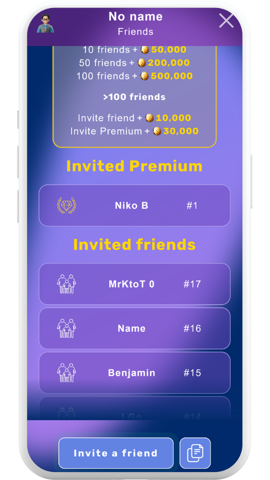 Share the game with your friends and watch your points skyrocket. You can easily send an invitation link to your friend at the bottom of the screen or copy the link to your clipboard.