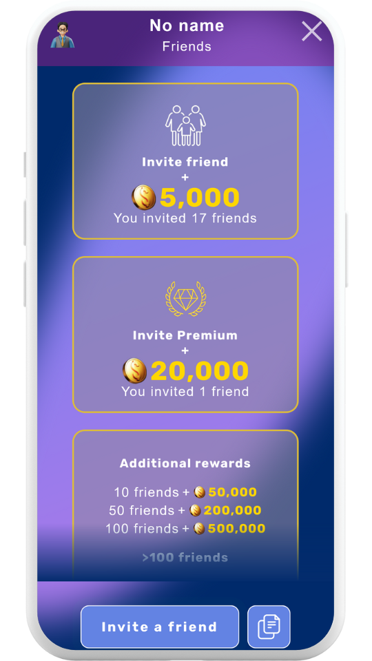 For each friend you invite, you’ll earn 5,000 points, and you’ll receive a whopping 20,000 points for inviting someone with a **Premium Telegram** account! Once you’ve invited over 100 friends, the rewards increase—10,000 points per invite, and 30,000 points for each **Premium Telegram** user you bring in.